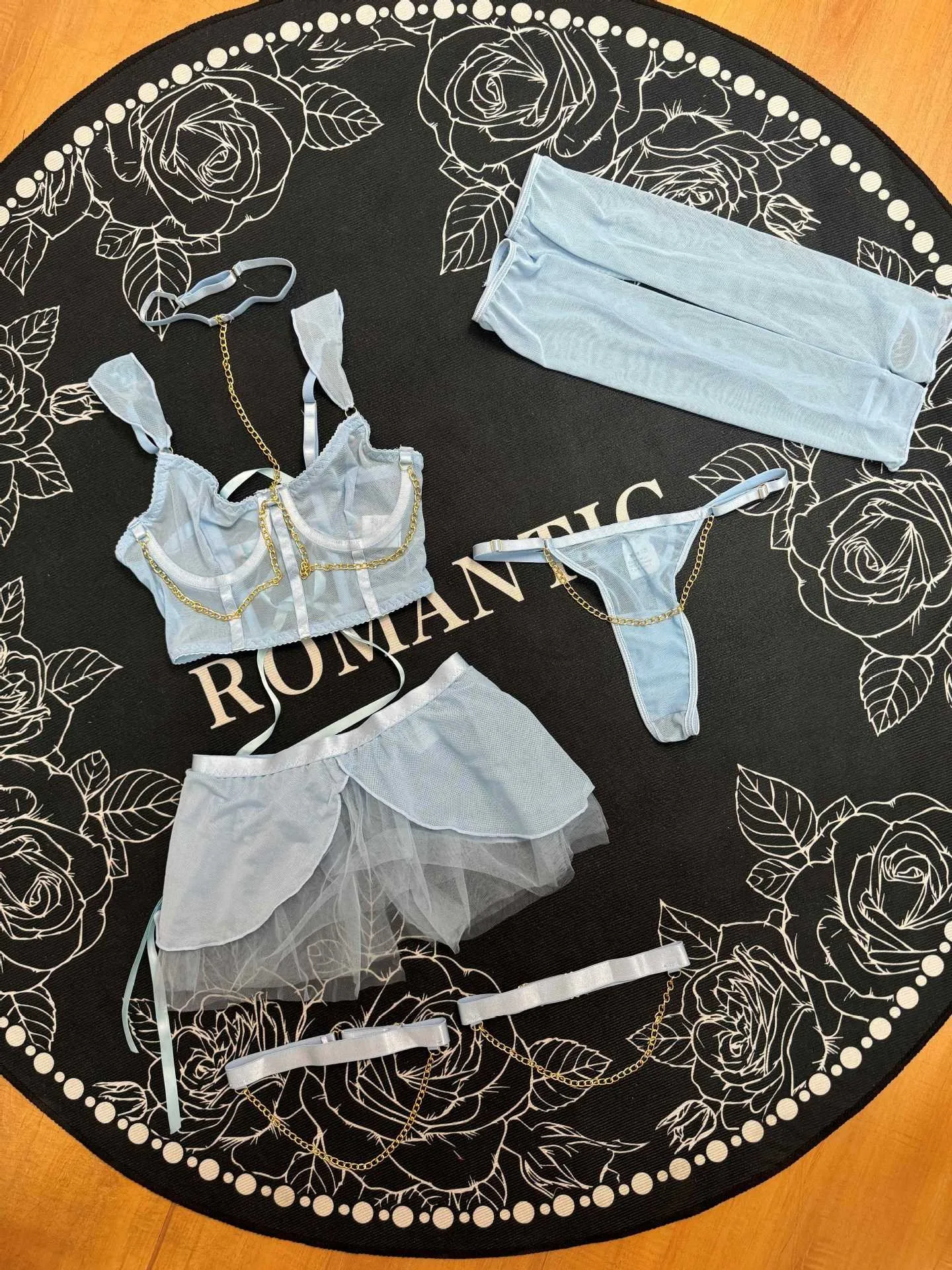 Fairy Women Lingerie Set Sexy Hot Erotic Tulle 5PCS Outfit with Attractive Chest Suspenders Chains Cuffs Back Bandage